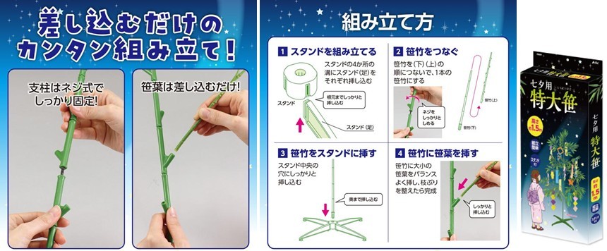 笹は、差し込むだけで簡単に組み立てができる七夕笹です。4本足のスタンド付きで、安定感があります。